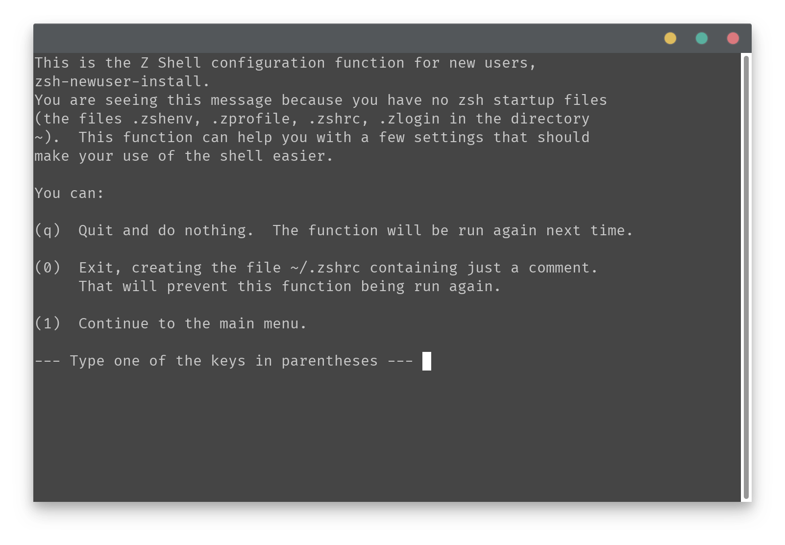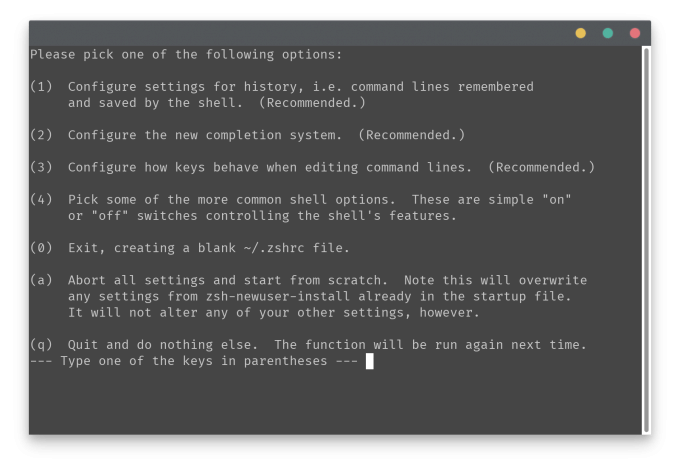 第一次进入 Zsh 会自动出现一个配置界面,这个界面可以根据需要自定义 Zsh。